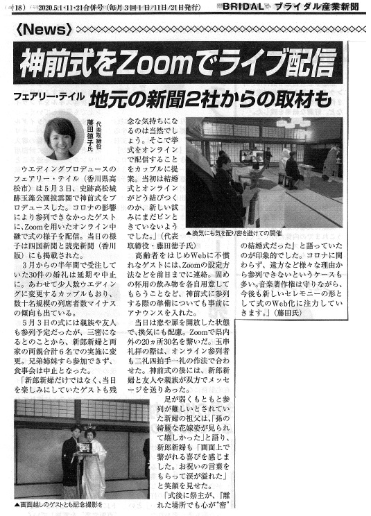 ウエディングプロデュースのフェアリー・テイルは、史跡高松城跡玉藻公園披雲閣で神前式をプロデュースした。コロナの影響により参列できなかったゲストに、Zoomを用いたオンライン中継で式の様子を配信。当日の様子は四国新聞と読売新聞にも掲載された。